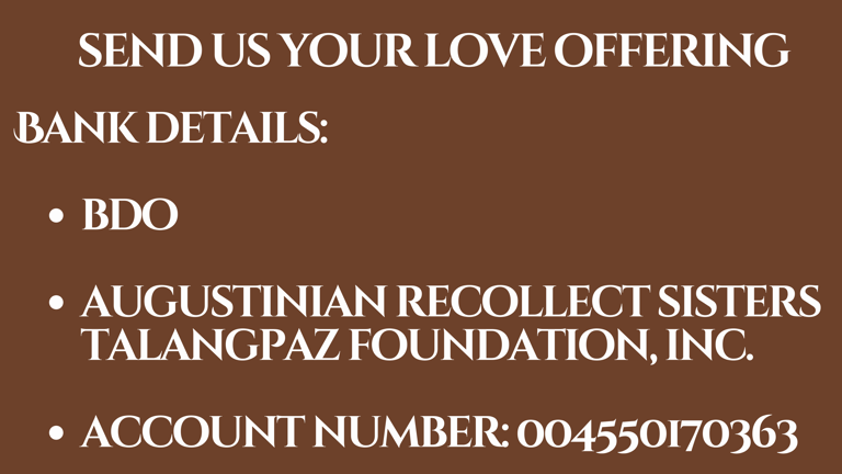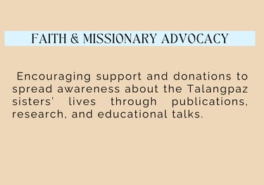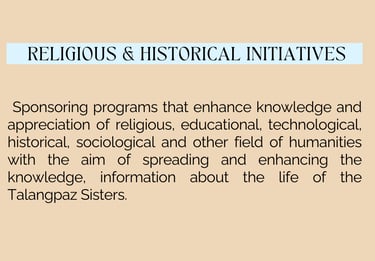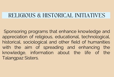 The Talangpaz Foundation, Inc. is dedicated to perpetuating the memory and mission of the Servants of God, Mother Dionicia and Cezilla Rossa Talangpaz, founders of the Augustinian Recollect Sisters in the Philippines. Their unwavering commitment to faith and service continues to inspire our work today. The foundation had already been actively fulfilling its mission under the leadership of Mo. Eufemia Lauzon, A.R., even before its official incorporation on July 12, 2002. It continues to uphold the legacy of the Talangpaz sisters through various initiatives rooted in faith, service, and devotion.