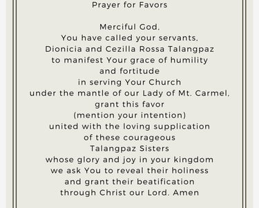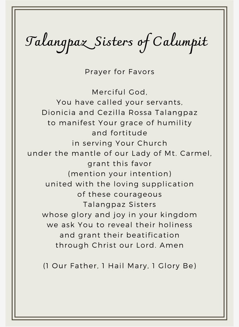 The faithful are encouraged to pray for the beatification of the Talangpaz Sisters and report any favors or miracles received through their intercession. Here’s how you can help: