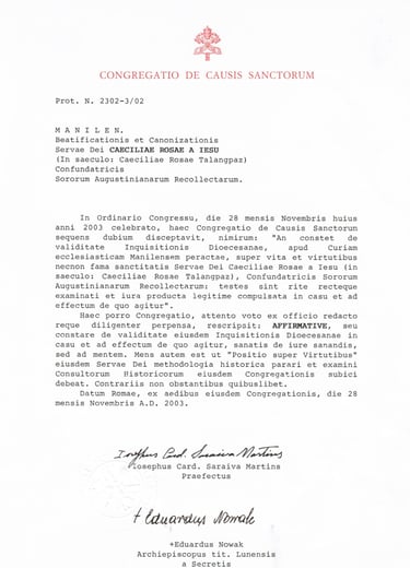 The Catholic Church recognizes the heroic virtues of individuals who have lived a life of extraordinary faith and service. Mother Dionicia and Cezilla Rossa Talangpaz were declared Servants of God, marking the first step in their journey toward sainthood. Their humility, perseverance, and devotion to Our Lady of Mt. Carmel de San Sebastian continue to inspire many, and their cause for beatification and canonization is actively being promoted.
